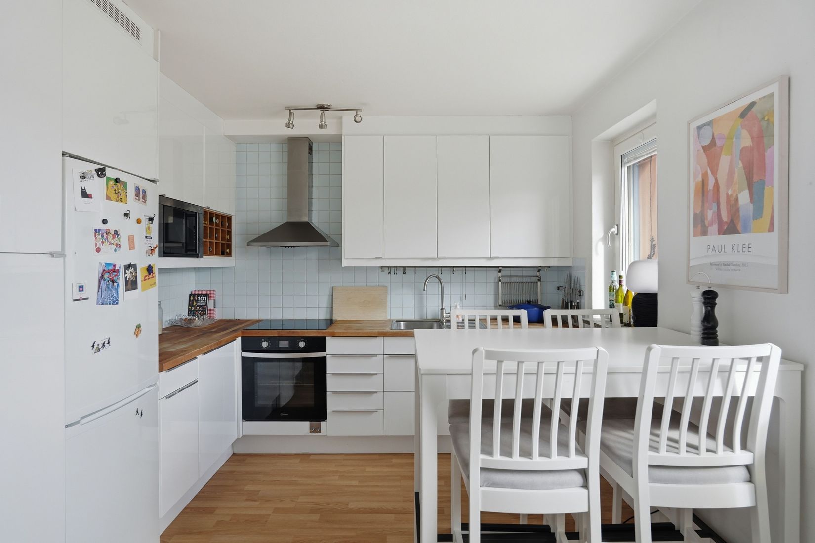 När du kliver in möts du av en praktisk hall med klinkergolv och bra förvaring i både garderober och överskåp. Köket är rymligt med fina materialval och gott om plats för ett större matbord, perfekt när du vill bjuda över vänner.