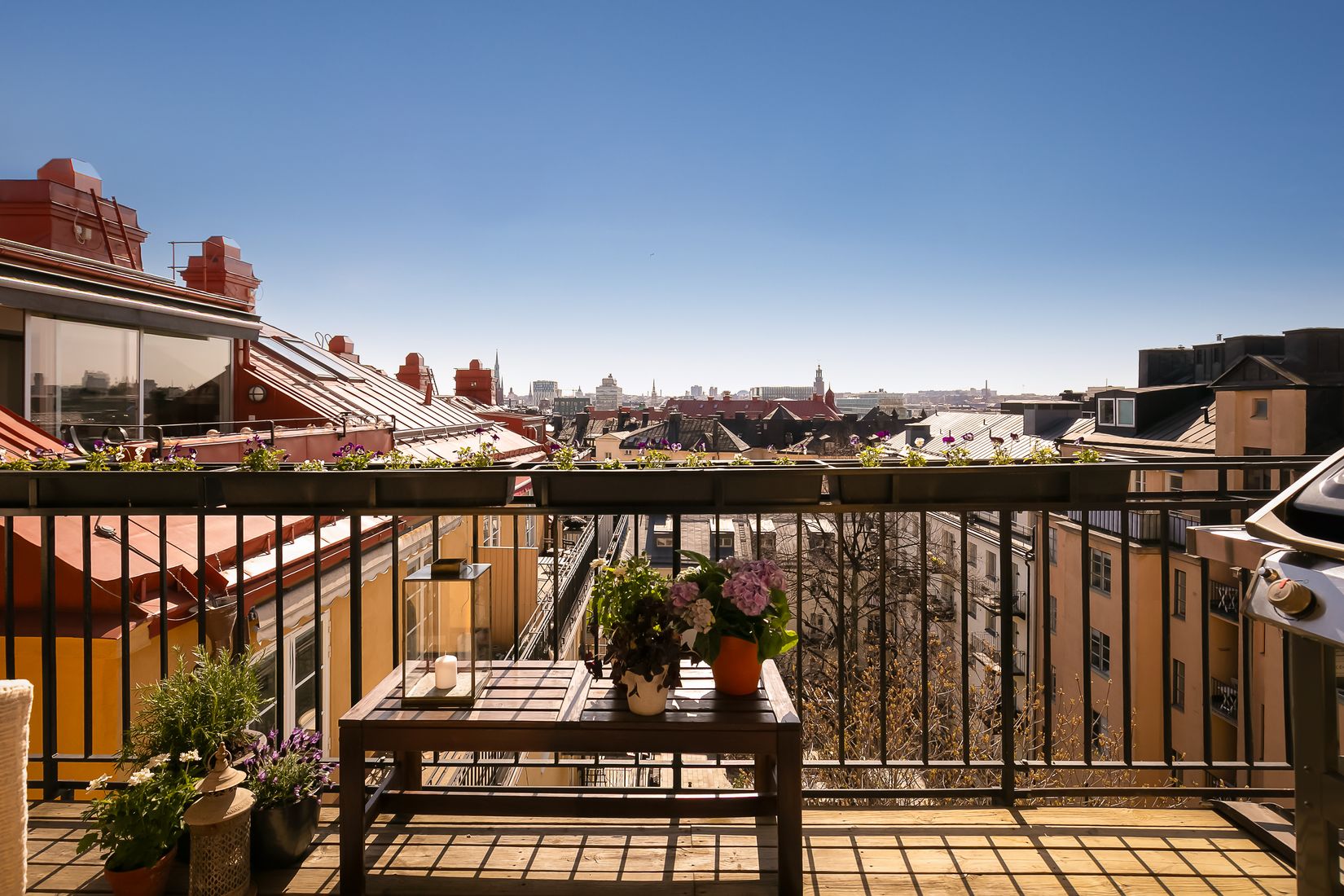 De båda kungsbalkongerna erbjuder en milsvid utsikt över Stockholms takåsar – en sällsynt lyx i innerstan. Den ena balkongen badar i sol från morgon till eftermiddag och bjuder på en hänförande utsikt som sträcker sig långt bortom stadens silhuett. Den andra balkongen vetter mot kvällssolen och är den perfekta platsen för middagar i solnedgången. På balkongerna finns möjlighet att grilla och duka upp för luncher och
