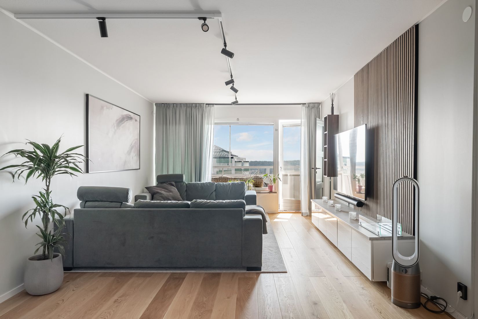 Bostaden är fullt inflyttningsklar och präglas av genomgående hög standard: stilrena ytskikt, ett avancerat Plejdsystem för smart belysningsstyrning via mobil, samt en genomtänkt planlösning som maximerar både rymd och ljusinsläpp. Det höga, insynsskyddade läget erbjuder en rofylld atmosfär och en tilltalande utsikt. Balkongen i soligt söderläge, med skjutbara glaspartier, fungerar som en naturlig förlängning av vardagsrummet och skapar en exklusiv året-runt-miljö.