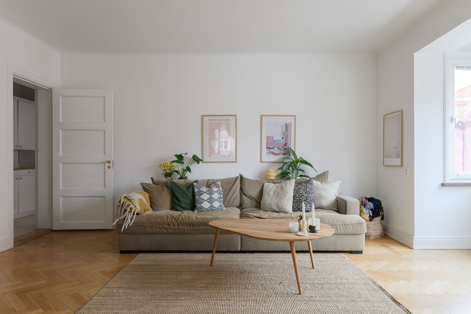 Bostaden bjuder på en tilltalande kombination av klassisk karaktär och modern funktion. Här möts du av generösa rum, vacker fiskbensparkett, ljusa brädgolv, stora fönsterpartier och fina pardörrar som skapar en luftig och inbjudande känsla. Vardagsrummet är socialt och lättmöblerat med gott om plats för både soffgrupp och matplats, medan köket erbjuder bra arbetsytor och plats för mindre matbord. Två rymliga sovrum ger flexibilitet för såväl familjen som den som önskar hemmakontor eller gästrum.
