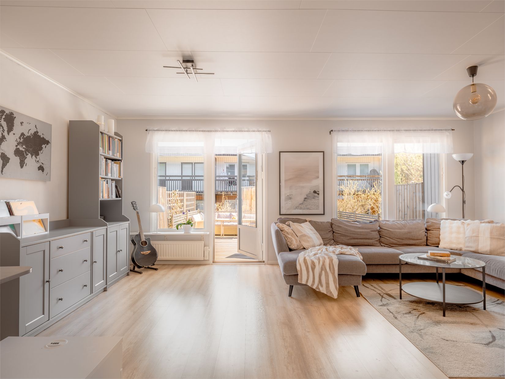 Här bor ni i bostad med flera härliga uteplatser och med ett attraktivt läge - allt placerat nära bad- och lekplatser samt strövområden. Planlösningen är mycket väldisponerad med en stor entrévåning som också är sällskapsvåningen, med kök, två matplatser, stort vardagsrum vidare till generös träbelagd altan på baksidan, gäst-wc och tvättstuga samt ett sovutrymme under trappen som även kan användas som förvaring i hallen. På övervåningen har ni inte mindre än fyra sovrum samt en klädkammare, där de två större sovrummen har utgång till balkongen. Det helkaklade badrummet på övre plan har wc, tvättställskommod och dusch. Till fastigheten hör ett separat förråd på framsidan. Här får du härliga utomhusytor med både en insynsskyddad atriumgård vid entrén med eftermiddag- och kvällssol och dessutom en stor öppen baksida med trevlig altan och gott om soltimmar. Detta gör också att du har sol - eller skugga för den delen - på någon av uteplatserna från morgon till kväll och gott om utrymme för grillning, avkoppling i en solstol eller sköna måltider utomhus på sommaren. Husets storlek med 4 sovrum på samma våningsplan rymmer enkelt en barnfamilj samtidigt som det även passar bra för ett par som vill "down-siza" från en större villa när barnen är utflugna, men inte vill tumma på storleken. Ni parkerar i garage med laddstolpe och bra parkeringsmöjligheter finns för besökande intill.