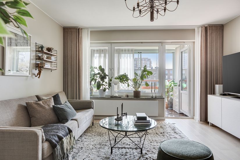 Det rymliga vardagsrummet erbjuder flexibla möbleringsmöjligheter och leder vidare ut till den stora, inglasade balkongen i soligt läge. Här har man skapat en ombonad miljö som känns som ett extra vardagsrum, smakfullt inrett med soffa, fåtölj, matta och gardiner – perfekt för både avkoppling och umgänge.