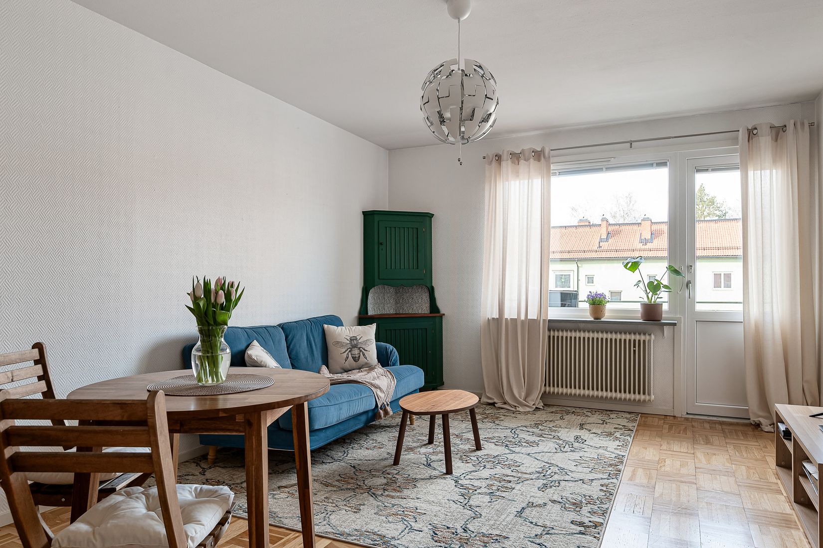 Det ljusa och luftiga vardagsrummet har ett stort fönsterparti som släpper in rikligt med dagsljus samt ett vackert mosaikparkettgolv. Här finns gott om plats för både soffgrupp och matsalsmöbler för den som önskar. Från vardagsrummet nås även den soliga balkongen, en perfekt plats för avkoppling.