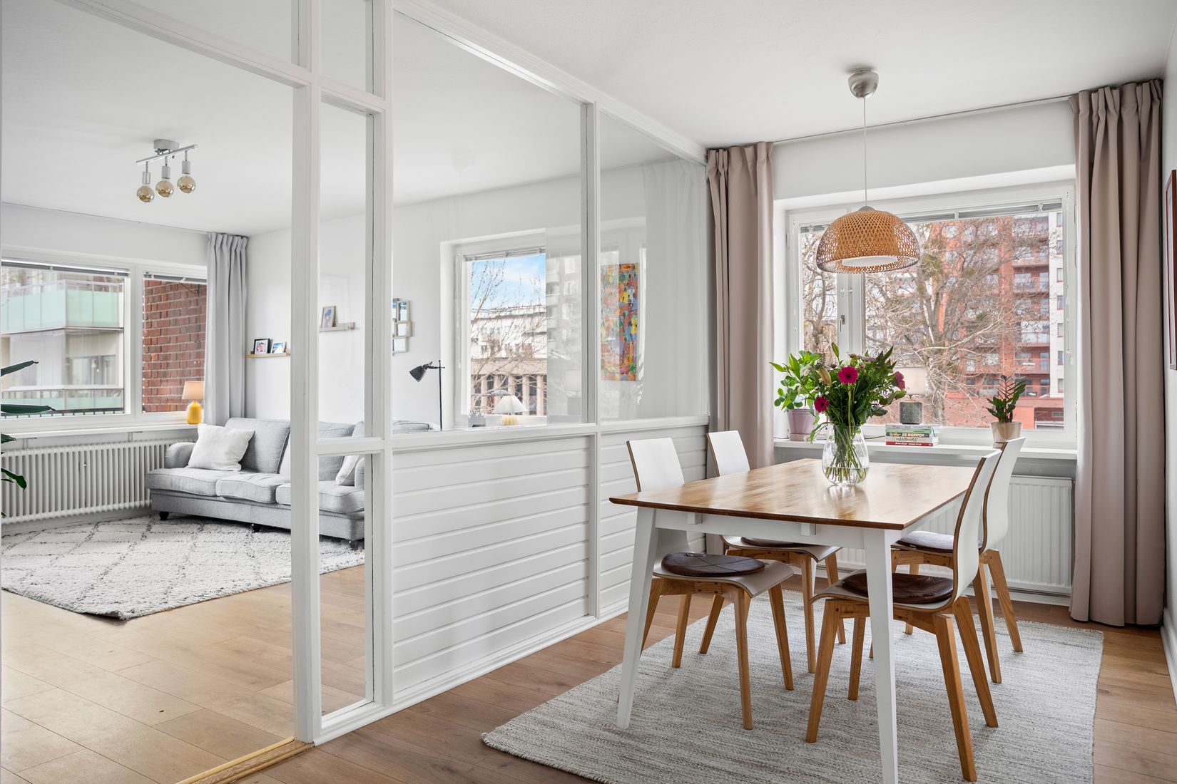 Välkommen till denna ljusa och trivsamma gavellägenhet högst upp i huset, ett hem som badar i ljus från tre olika väderstreck. Här möts du av generösa ytor och en planlösning som bjuder in till både vardagsliv och sociala tillställningar. Det rymliga vardagsrummet har en utgång till en solig balkong i västerläge där du kan njuta av eftermiddagssol och sjöglimten. I anslutning finns en separat matplats, avskild med glaspartier, som rymmer större middagar. Köket är modernt och funktionellt med ljusa materialval och gott om arbetsyta. Bostaden erbjuder tre välplanerade sovrum, idealiska för familjen eller för dig som vill kombinera boende med hemmakontor. Det helkaklade badrummet är stambytt och det finns även en separat gästtoalett. Förvaringsmöjligheterna är goda med både garderober och klädkammare. Dessutom tillhör förråd + matförråd i källaren.