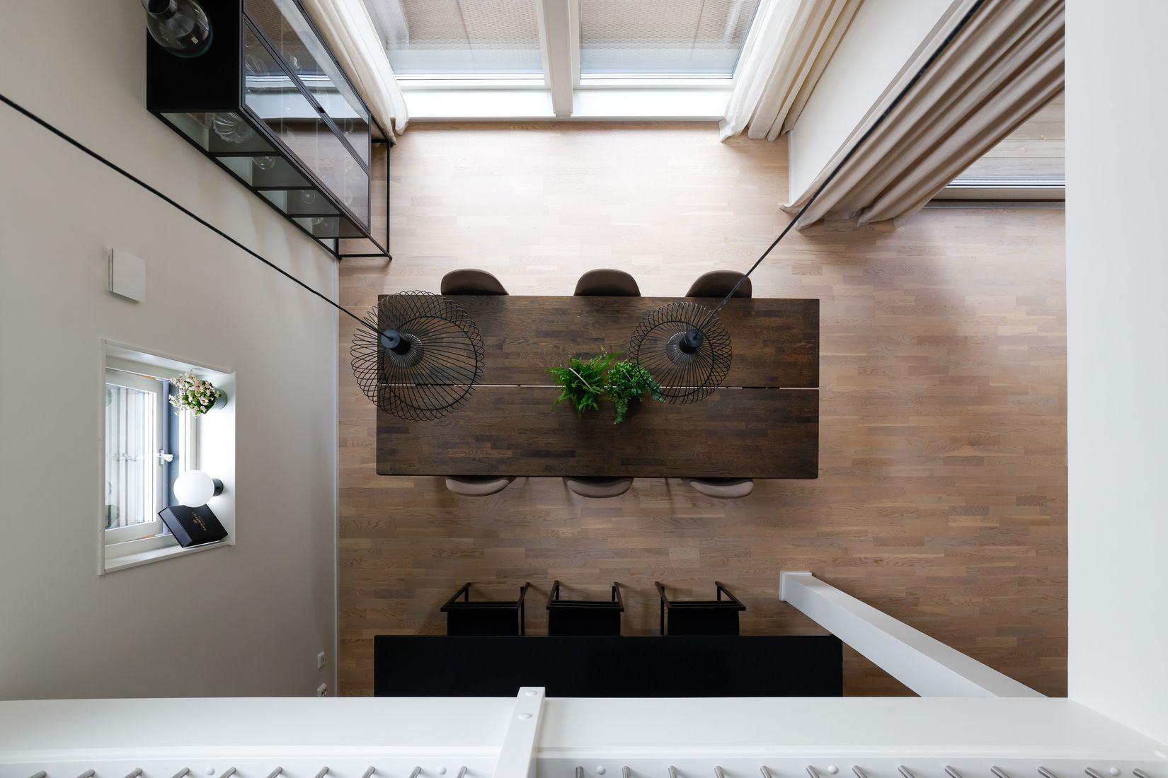 Redan i entrén sätts tonen. Blicken dras vidare in i bostaden och landar i den öppna planlösningen där kök, matsal och vardagsrum möts i en social helhet. Vid matplatsen öppnar huset upp sig på riktigt – här sträcker sig takhöjden hela vägen upp mot ovanvåningen och skapar en imponerande rymd. Ljuset faller in från stora fönsterpartier och ger en luftig, nästan svävande känsla. Det är en plats som både är storslagen och varm på samma gång.