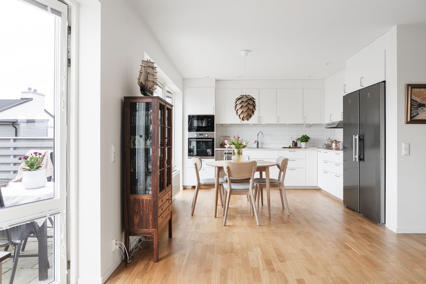 Utemiljön är något alldeles extra, med liten trädgård med gräsmatta och två uteplatser som förlänger bostaden och ger fina möjligheter att följa solen under dagen. På den nordostvända sidan kan du njuta av morgonsolen, medan uteplatsen i sydvästläge bjuder på härliga eftermiddagar och kvällar – perfekt för middagar och avkoppling utomhus.