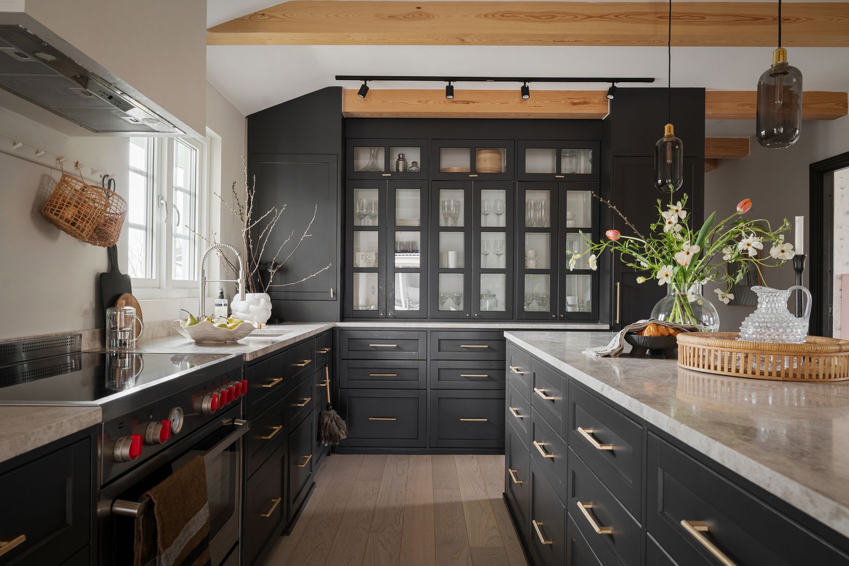 Redan vid första steget in möts du av en känsla som för tankarna till ett inredningsmagasin. Ljuset, rymden och materialen samspelar på ett sätt som känns både genomtänkt och självklart. Kalkstensgolv i hallen, vackra synliga takbjälkar och ett stilrent kök med marmorskivor skapar en exklusiv men samtidigt varm och inbjudande helhet.