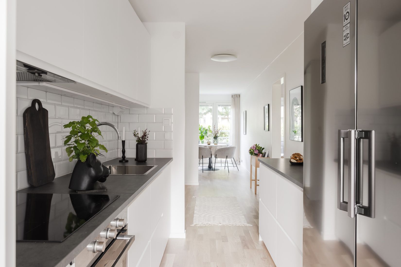 Den fräscha och stilrena hallen välkomnar dig med praktisk förvaring. Vidare nås köket som imponerar med sina moderna ytskikt, fullt utrustat med kyl/frys, diskmaskin, integrerad ugn och micro. Den rymliga arbetsytan och de vita kaklade väggarna ger ett rent och inbjudande intryck.