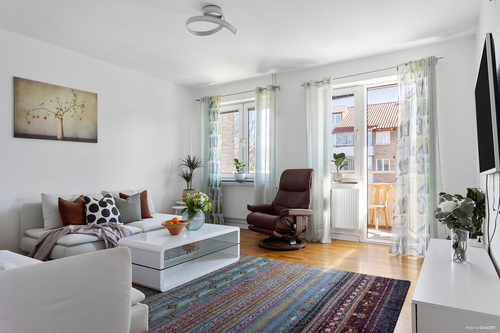 I ett grönskande och trivsamt kvarter har vi nu nöjet att presentera denna ljusa och välplanerade tvårummare om 52 kvm. Bostaden är belägen högt upp i huset på ett insynsskyddat läge och en genomgående planlösning som skapar ett härligt ljusflöde. Redan i hallen möts du av en luftig och fräsch känsla. Vardagsrummet är lättmöblerat och erbjuder gott om plats för en större soffgrupp samt har utgång till den generösa balkongen. Sovrummet är väl tilltaget med plats för dubbelsäng och goda förvaringsmöjligheter. Köket är stort och funktionellt med plats för matbord samt gott om förvaring. Lägg där till ett helkaklat badrum renoverat 2017. Här bor du i välskötta HSB Brf Oxeln med låg belåningsgrad. Föreningen erbjuder fina gemensamhetsutrymmen såsom bastu- och träningsrum, samlingslokal samt parkeringsplatser för uthyrning.