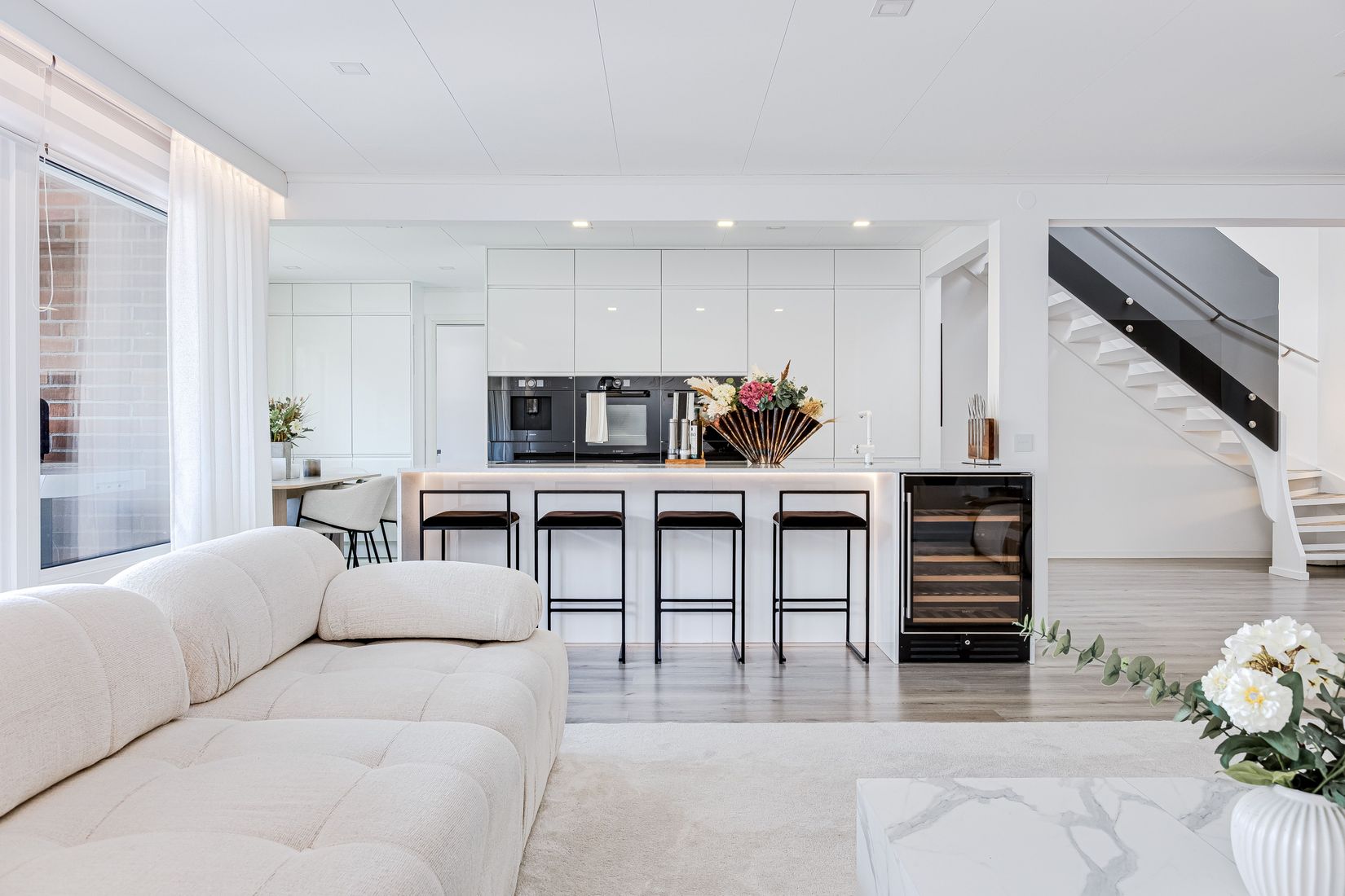 Den öppna planlösningen mot det smakfulla och påkostade köket skapar en social och inbjudande miljö, där den breda köksön med sittplatser och vinkyl blir hemmets naturliga samlingspunkt. Köket är utrustat med integrerade vitvaror, dubbelugn, kaffemaskin och en trivsam matplats med utsikt mot altanen. Här finns även en praktisk groventré med tvättstuga och direkt access till det inbyggda garaget med gott om förvaring.