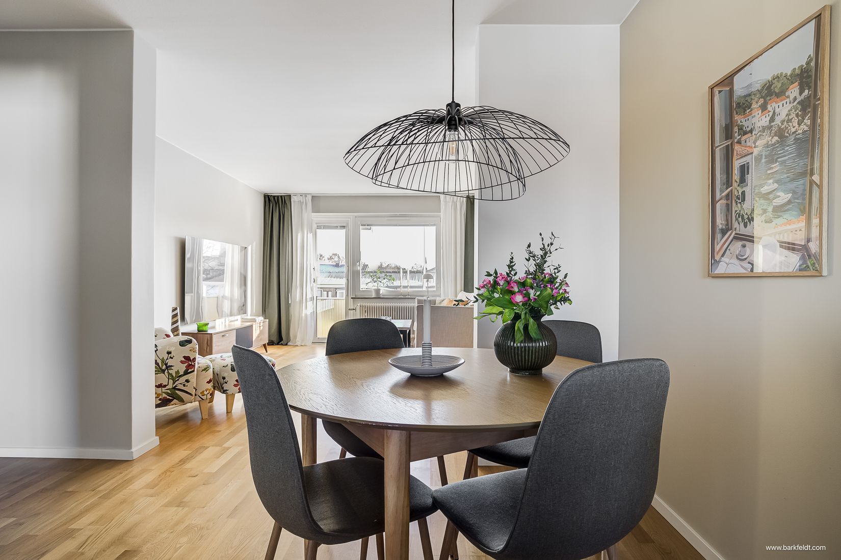 Den ljusa genomgångslägenheten har enhetliga parkettgolv och renoverades år 2023 med nya ytskikt och målade snickerier samt så fick köket sig en uppdatering. Planlösningen erbjuder välkomnande hall med garderobsförvaring bakom skjutdörrar, två bra sovrum med garderobsförvaring och inbjudande och ljust vardagsrum med dörr ut till balkongen, i söderläge med skön vy över gården. Delvis öppen planlösning, med matplats i anslutning till det fina köket som är fullt utrustat. Avslutningsvis finns ett påkostat badrum med infällda spotlights i taket, enhetlig kakel/klinker, vägghängd wc, takdusch och tvättmaskin. Lägenhetsinnehavarna disponerar ett vindsförråd och ett källarförråd.