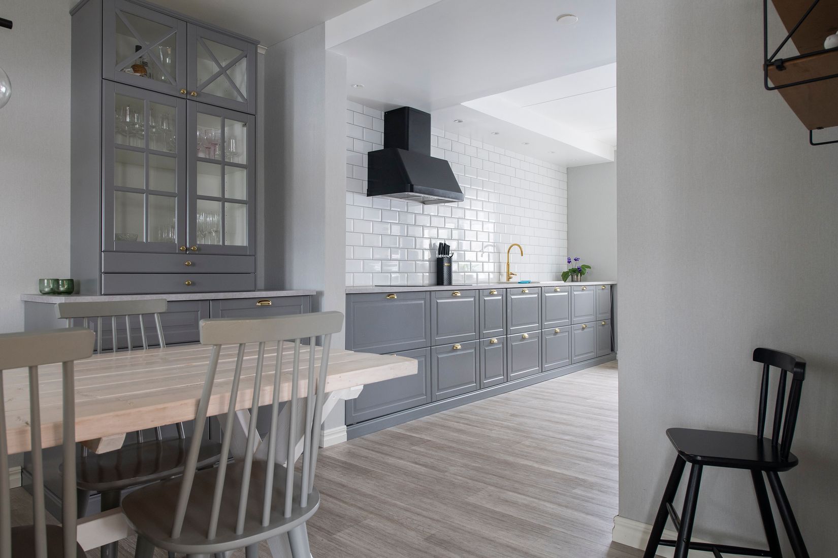 På sydvästra sidan har huset en stor altan och en inglasad uteplats där du kan njuta av härliga dagar året runt. Köket är modernt och stilrent med gråa skåpluckor, gulddetaljer och en tidlös kaklad vägg.