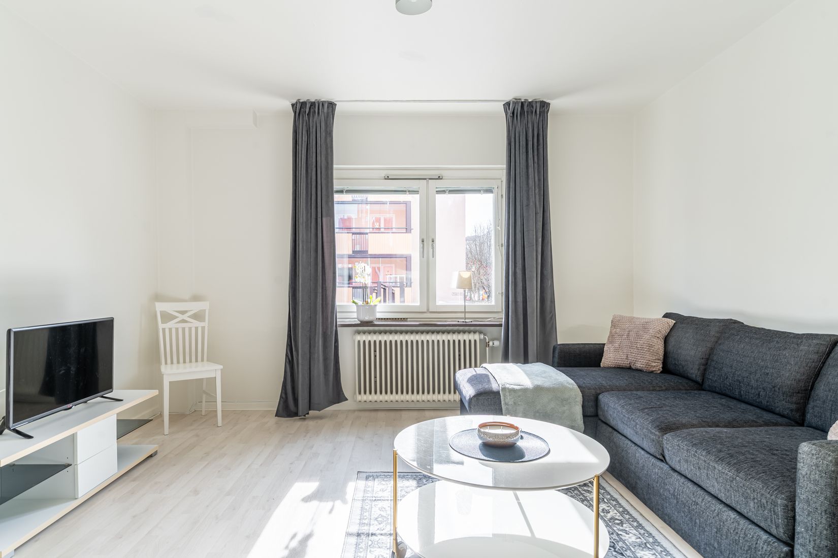 Möjlighet att förvärva en stilfullt möblerad etta med attraktivt läge nära centrum. Både bostaden och möblerna är i det närmaste oanvända sedan nuvarande ägares förvärv. Lägenheten omfattar 32,4 kvm och är belägen en trappa upp i huset. Hallen erbjuder bra avhängningsmöjligheter direkt innanför dörren, kompletterat med ett praktiskt väggskåp samt en rymlig klädkammare. Rummet är ljust och möblerat med en smart bäddsoffa och här ingår även tv. Den moderna kokvrån har gröna luckor med smakfulla mässingsdetaljer, och badrummet är utrustat med dusch. Här ges möjlighet till snabb inflytt.