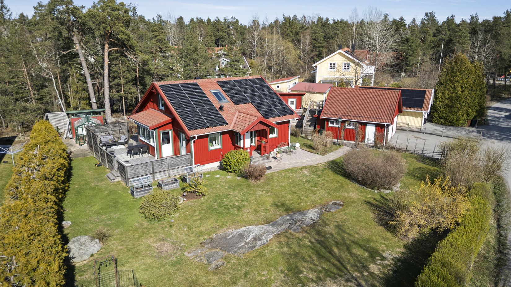 Inbjudande och privat tomt om 1 200 kvm som är inhägnad och omges av täta häckar, klassisk gärdsgård och staket. Här samsas en härlig kombination av bland annat plana gräsytor, berg i dagen, grusade och stenlagda gångar, uppvuxen grönska och välskötta rabatter inramade av cortenstål. För den odlingsglade finns även ett vackert växthus, ett potatisland, två miniväxthus på pallkrage samt en trädgårdsbod. Vill man slappna av och ha sociala umgängen finns en stor altan i väster med både pergola och bred markis för varma sommardagar. På husets baksida finns en altan med härlig morgonsol och på framsidan finns en grusad uteplats i soligt söderläge! Denna tomt badar i sol från morgon till kväll och har allt man kan önska sig!
