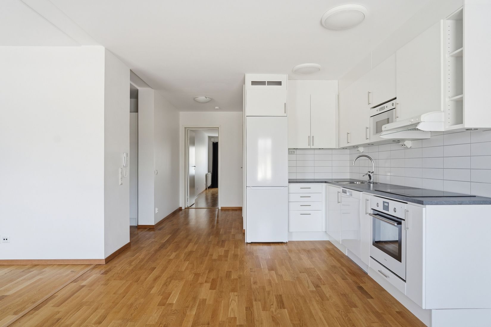 Bostaden erbjuder en öppen och social planlösning mellan kök och vardagsrum som bjuder in till både vardagsliv och umgänge. Här rör sig ljuset fritt genom rummen och förstärker känslan av rymd. Den välkomnande hallen ger ett prydligt första intryck och erbjuder plats för smidig avhängning i garderoberna.