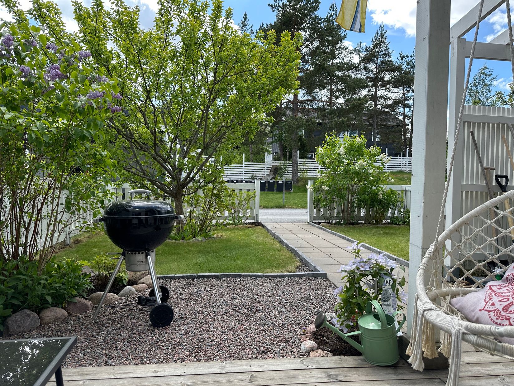 Tomtens är delvis inramad av staket och erbjuder flera härliga uteplatser, dels mot baksidan med uteplats samt solterrass och mot framsidan en balkong med förmiddagssol. Liten välplanerad och lättskött trädgård med odlingsmöjligheter. Här finns bland annat rabarber och hallon!