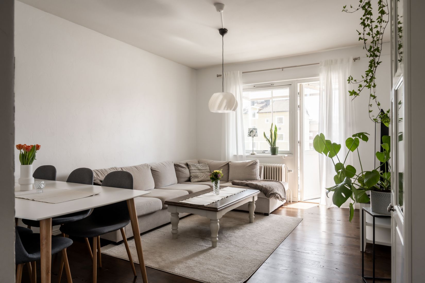 Lägenheten erbjuder två rymliga sovrum, ett trevligt kök, helkaklat badrum och ett härligt vardagsrum med utgång till den inglasade balkongen som blir som en förlängning av rummet. Med ett högt och fritt läge får du solsken hela dagen. Dessutom är det privat och skönt utan något hus mitt emot.