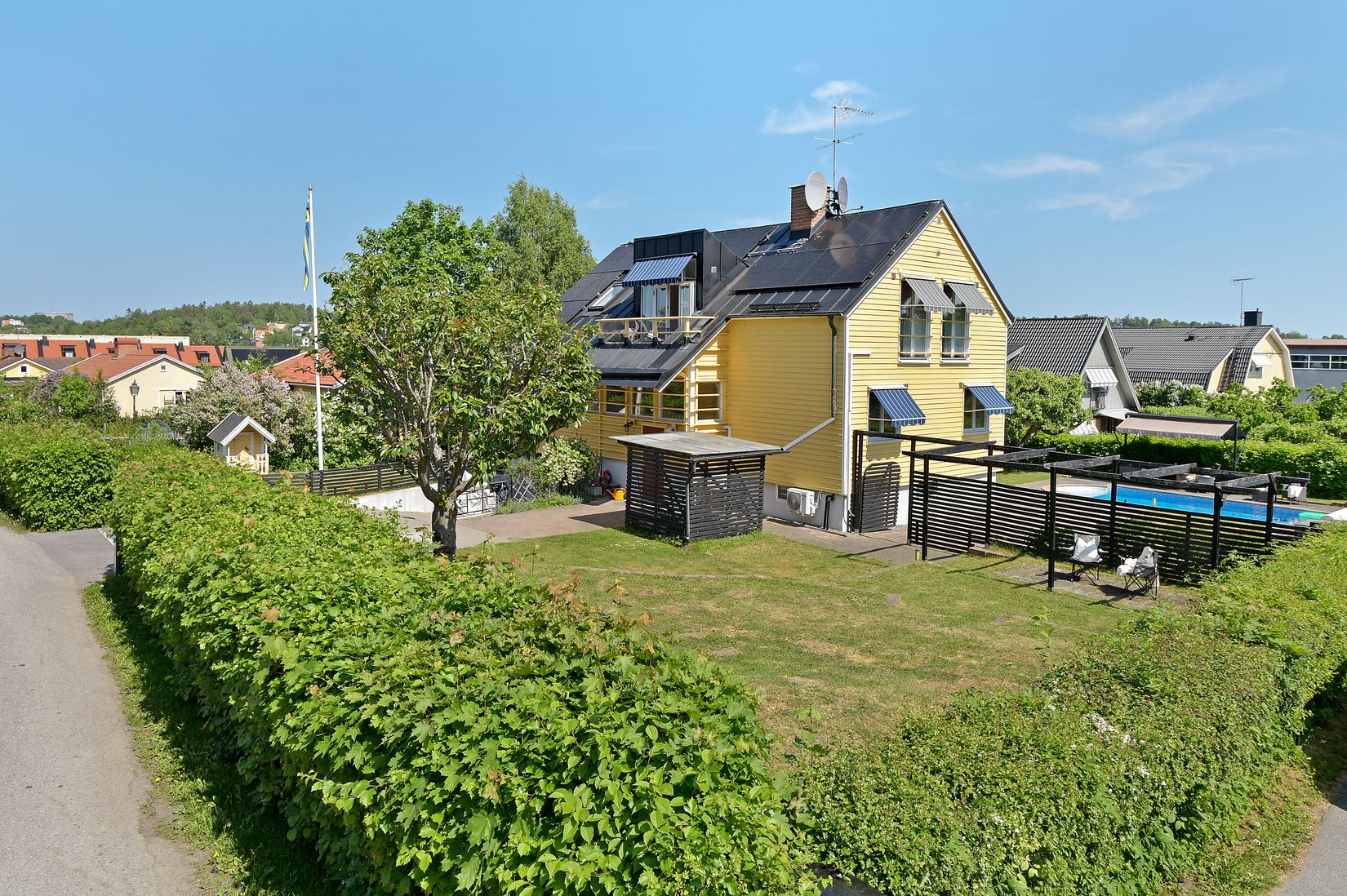 - en fantastisk tomt om 1.175 kvm är perfekt för bollspel och lek, har välfyllda rabatter samt frukt och bär. Tomten badar i sol från morgon till kväll.