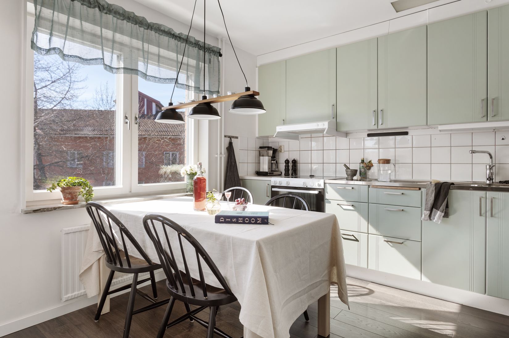 I anslutning till vardagsrummet ligger det fullt utrustade köket med goda arbetsytor och bra förvaring i ljusgröna över- och underskåp. Ovan arbetsytorna sitter vitt kakel som ger ett stilrent intryck. Här finns dessutom plats för en matgrupp om 4–6 personer vid ett större fönsterparti som ger ett fint ljusinsläpp.
