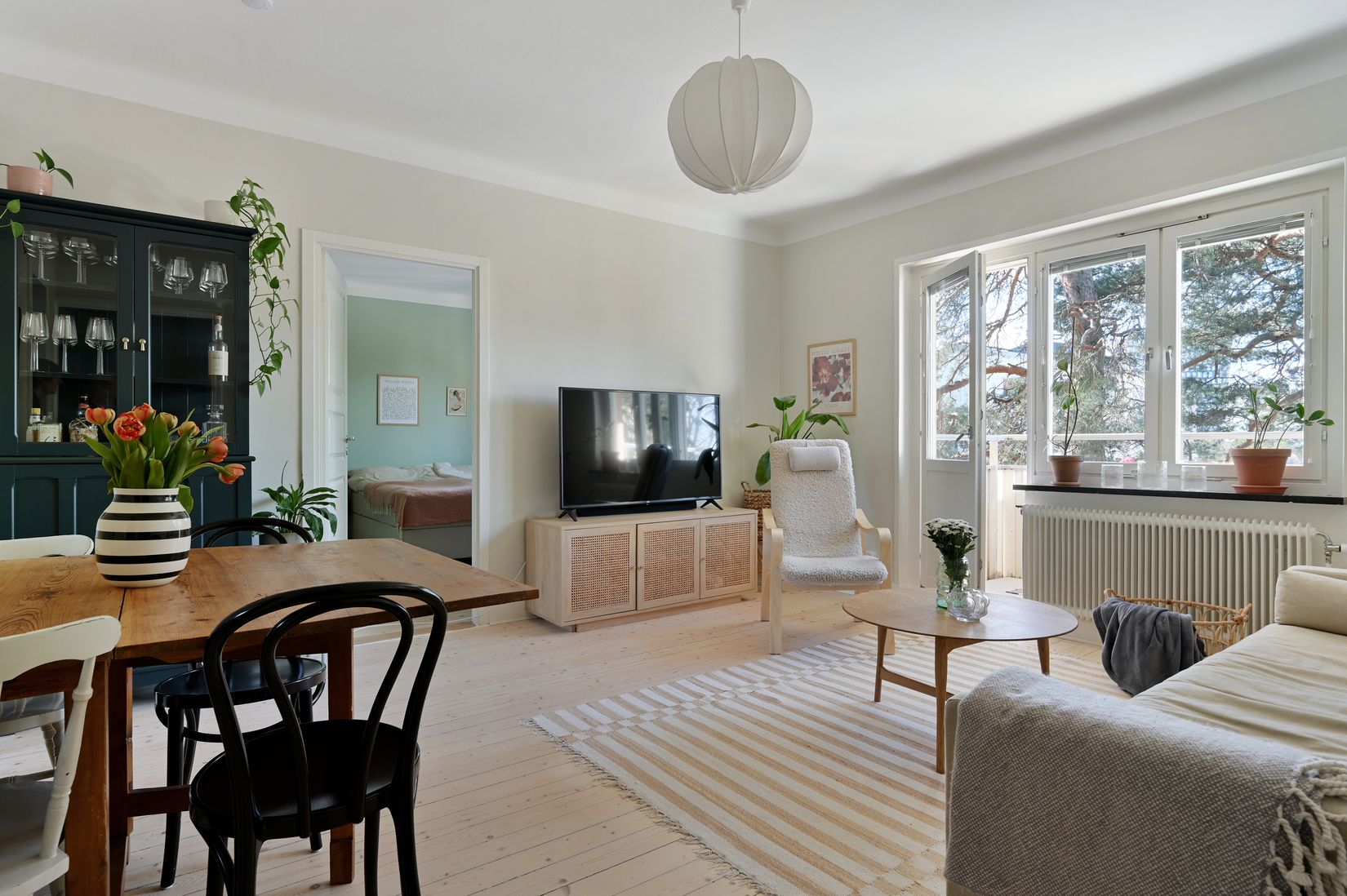 Vardagsrummet är luftigt och lättmöblerat med plats för både soffgrupp och matplats. Härifrån nås balkongen i västerläge som blir en naturlig förlängning av rummet under årets varmare månader. Balkongen erbjuder eftermiddags- och kvällssol samt en rogivande utsikt mot grönska.