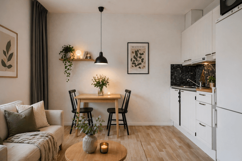 vilket ger en naturlig plats för sängen och frigör utrymme för både soffgrupp och matplats.