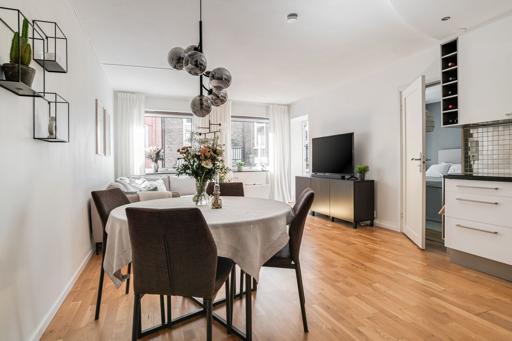 Vardagsrummet är ljust och luftigt med ett fint ljusinsläpp som skapar en trivsam atmosfär. Härifrån nås den inglasade balkongen i solsäkert söderläge som blir en naturlig förlängning av bostaden och en uppskattad plats att vistas på stora delar av året.