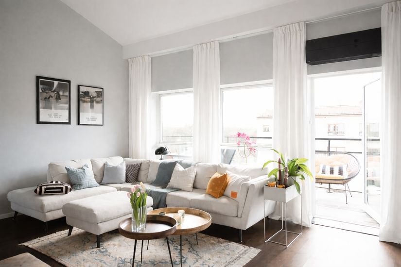 Bostaden erbjuder en öppen och inbjudande planlösning där kök och vardagsrum samspelar på ett naturligt sätt och skapar en social och luftig atmosfär. Att bostaden dessutom är öppen till nock med generös takhöjd ger en fantastisk känsla av rymd och karaktär. De stora fönsterpartierna släpper in rikligt med ljus och förstärker ytterligare den luftiga känslan. Här finns gott om plats för både soffgrupp och matplats. För extra komfort under årets varmare dagar är bostaden även utrustad med installerad aircondition och markiser.