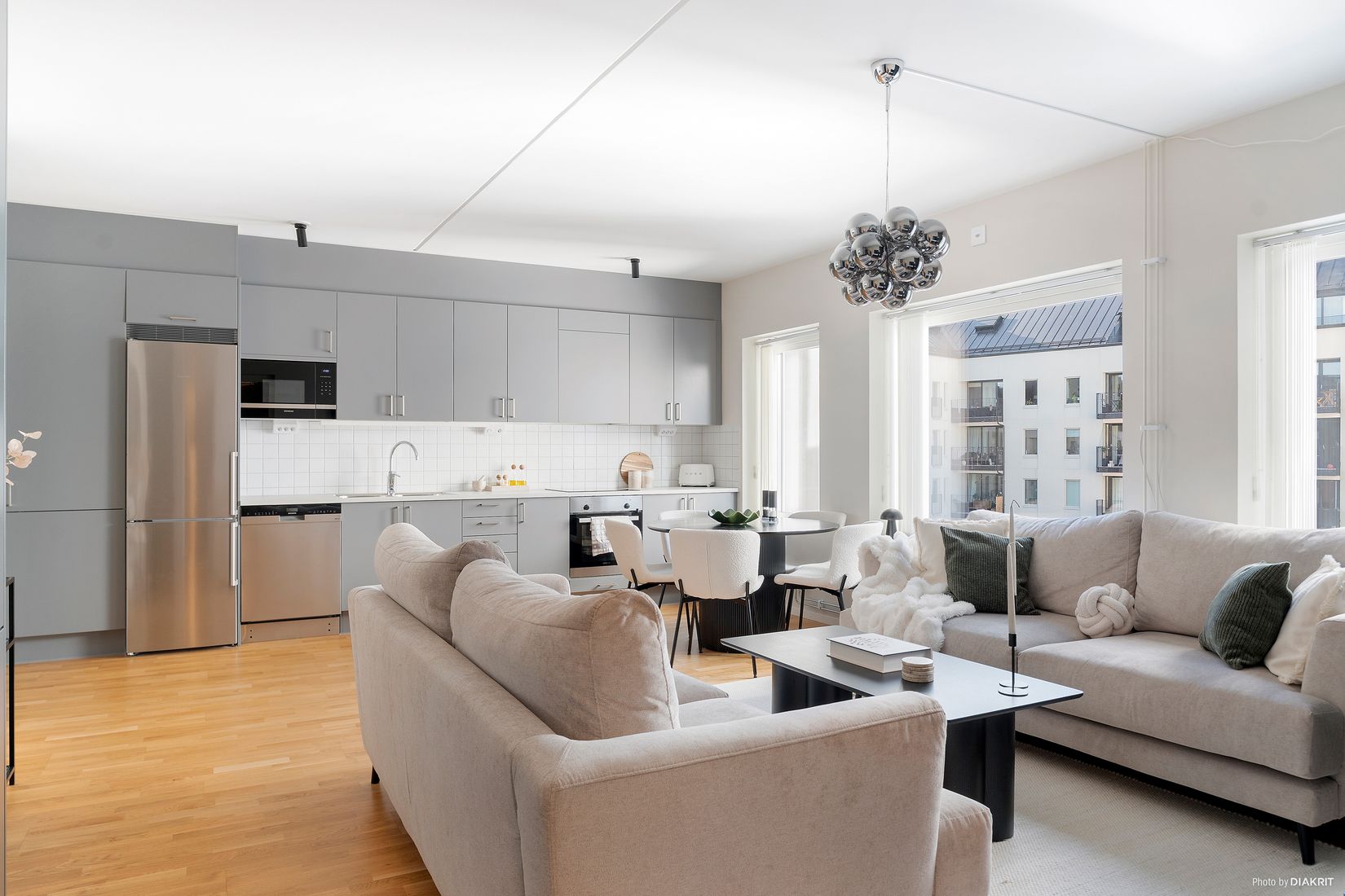 Bostaden präglas av genomgående hög standard med enhetligt parkettgolv och smakfulla materialval. Det moderna köket från Marbodal i grå kulör kombineras med vitt kakel ovan arbetsytorna och erbjuder generösa förvaringsmöjligheter samt bra arbetsytor. Köket ligger i öppen planlösning mot vardagsrummet vilket skapar en social och trivsam yta med gott om plats för både matgrupp och soffdel. Från vardagsrummet nås den soliga balkongen som blir en naturlig förlängning av bostaden under årets varmare månader.