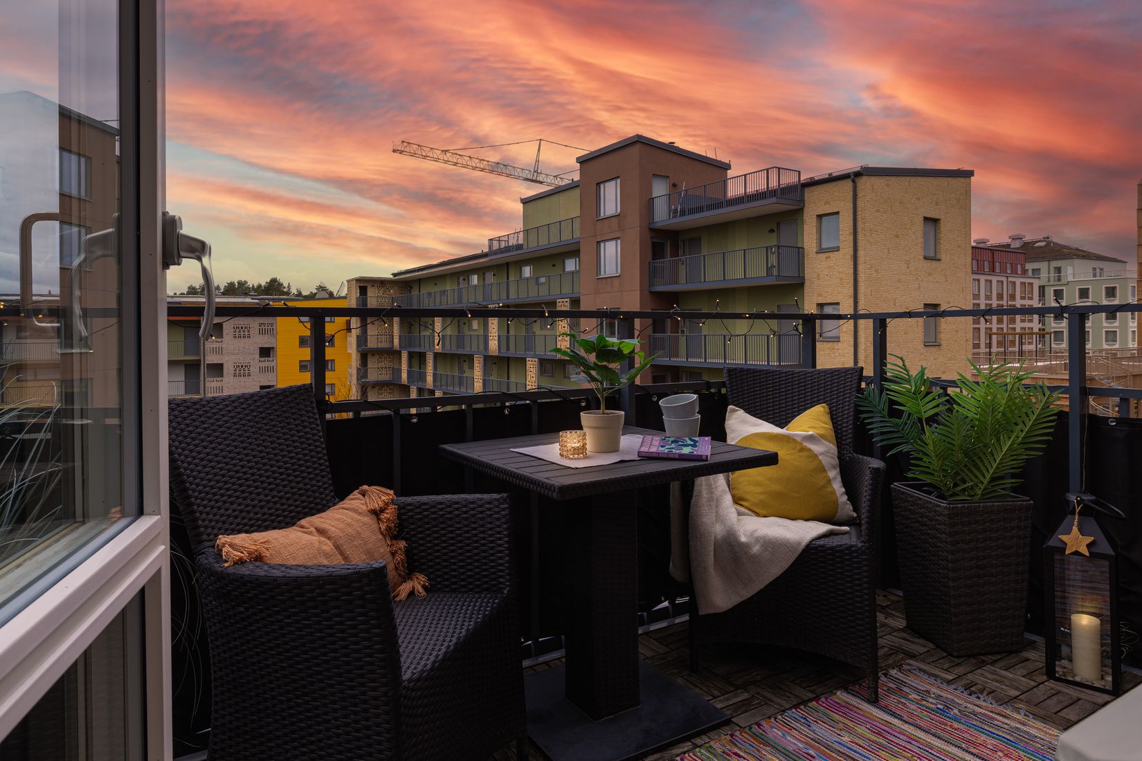Balkongen blir en naturlig förlängning av bostaden och erbjuder gott om plats för både loungemöbler och grill. Här kan du njuta av härliga middagar i solen och skapa en social oas under årets varmare månader.