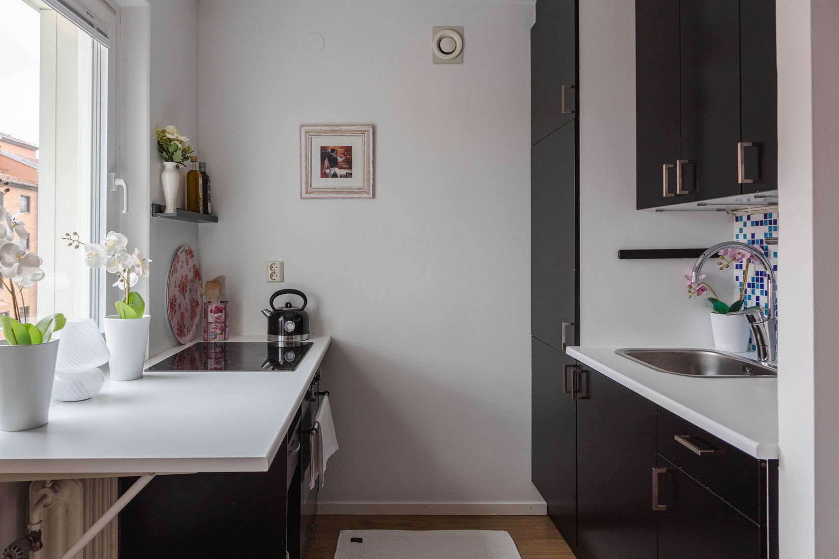 Badrummet är helkaklat i en stilfull kombination av ljusa och mörka kulörer och erbjuder en modern och elegant känsla. Här finns även plats för tvättmaskin för extra bekvämlighet. Köket är välplanerat med goda arbetsytor, bra förvaring och en mindre matplats vid fönster som ger fint ljusinsläpp.