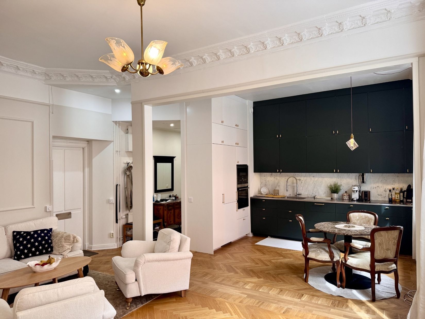 Bostaden är belägen en trappa upp och erbjuder en genomgående hög standard där välbevarade originaldetaljer möter stilrena, samtida materialval. Den generösa takhöjden om ca 3,20 meter tillsammans med stora speglade fönster i djupa nischer skapar ett fantastiskt ljusinsläpp och en luftig, exklusiv atmosfär. Här återfinns klassiska attribut såsom fiskbensparkett, stuckaturer, takrosetter, speglade dörrar och höga golvsocklar - allt i en harmonisk färgsättning.