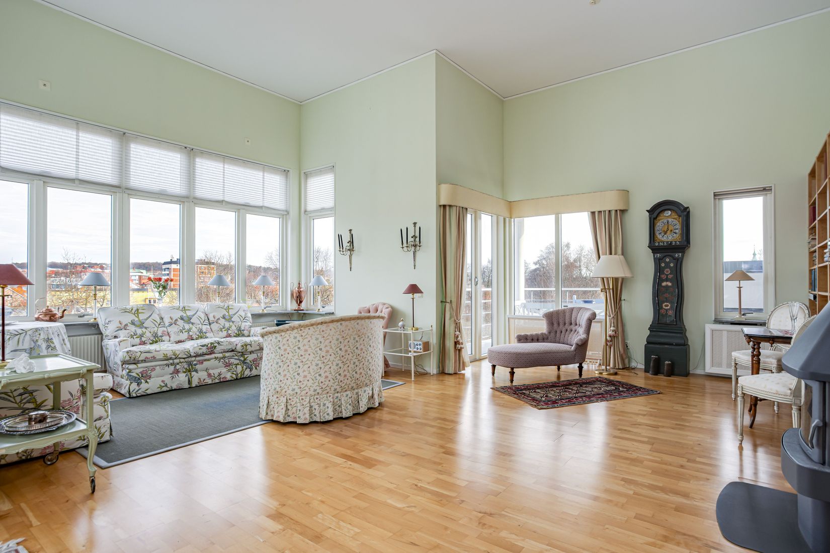Bostadens hjärta är det imponerande vardagsrummet, där den höga takhöjden skapar en härlig känsla av rymd och elegans. Den öppna spisen ger både värme och karaktär, och härifrån nås även bostadens två balkonger – en sällsynt och mycket uppskattad fördel. Balkongerna är generösa, delvis under tak och belägna i högt och fritt läge med fin utsikt över grönska och omgivning.