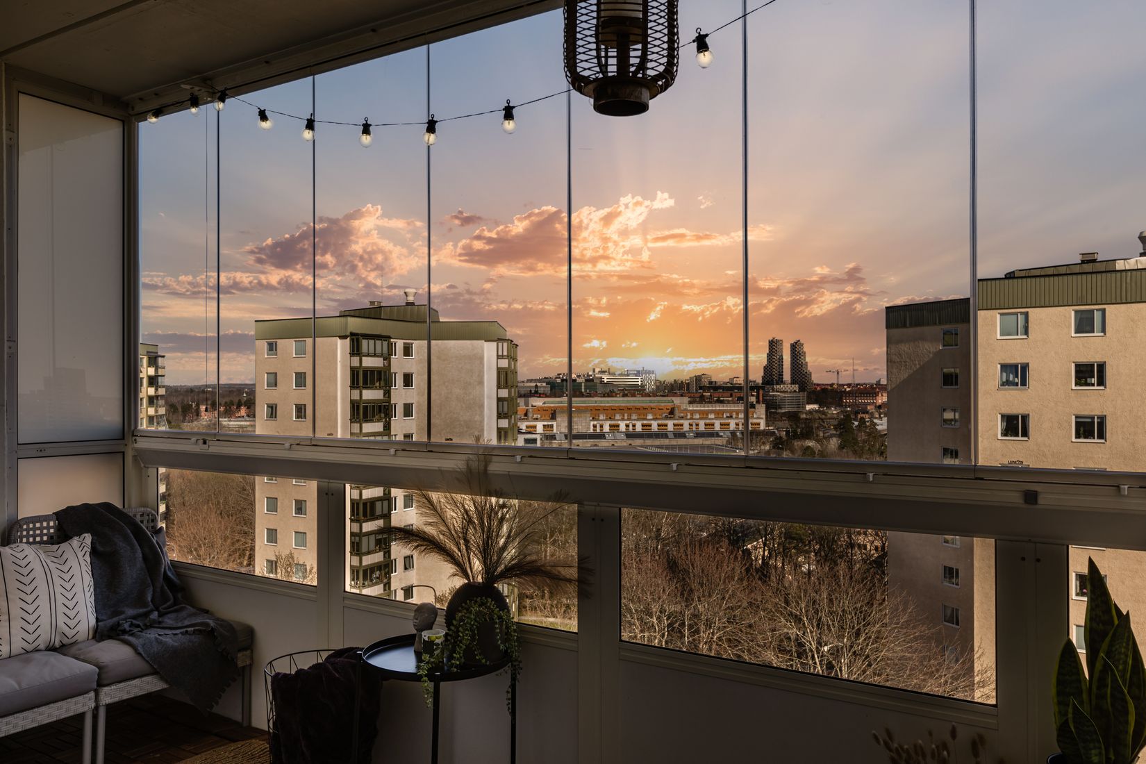 Kollar vi på interiören så kan vi konstatera att köket som stilrent går i vitt, är fulltrustat, renoverat och ligger med fin öppenhet mot hallen och i anslutning till vardagsrummet. All maskinell utrustning i badrum och kök från det etablerade vituvarumärket Bosch. Vardagsrummet, som är stort och lättmöblerat, har en stor inglasad balkong i högt läge med fin utsikt mot innerstan. Sett till det praktiska så finns här gott om förvaring i lägenhetens många garderober. Sovrummen, som inklusive uthyrningsdelen, är tre till antalet, ligger samtliga med ett helt insynsskyddat och lugnt läge mot den lummiga baksidan med grönytor och höga tallar.