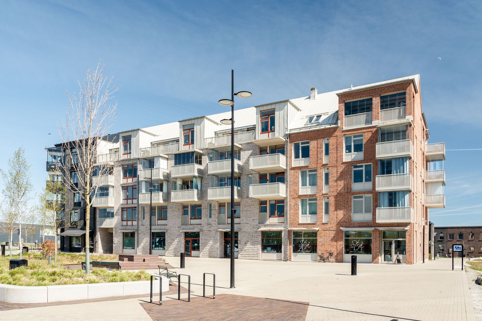 Lägenhetens öppna planlösning mellan kök och vardagsrum skapar en social och luftig miljö där matlagning och umgänge flyter samman. De ljusa och neutrala färgerna ger en stilren bas som är lätt att möblera och sätta egen prägel på.