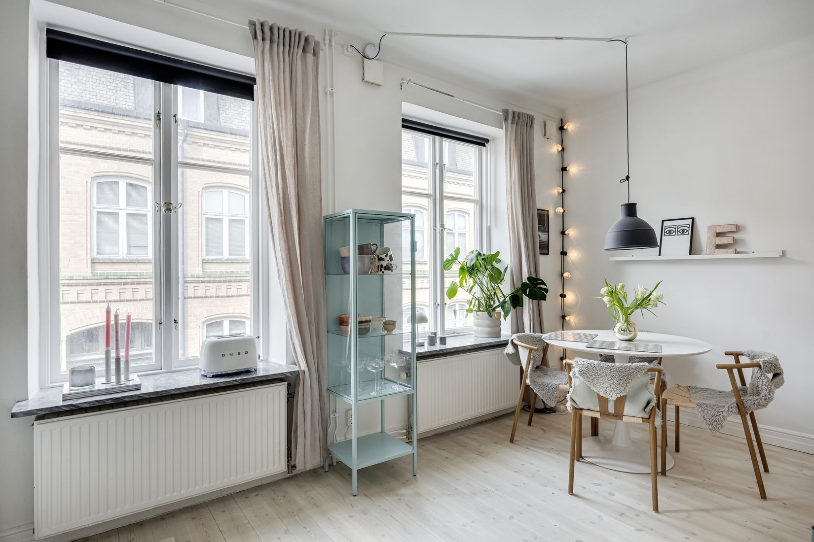 Lägenheten sträcker sig över två plan och bjuder på ett generöst ljusinsläpp som fyller rummen med naturligt dagsljus.