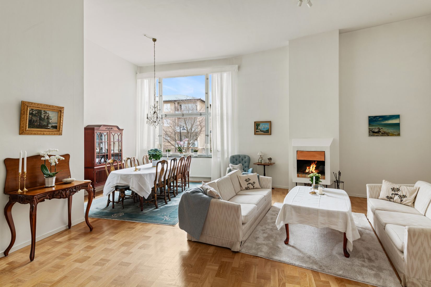 Här möts du av en ljus och inbjudande atmosfär där varje detalj är noggrant genomtänkt. De generösa sällskapsytorna bjuder in till både sociala tillställningar och avkopplande stunder med familjen. Stora fönsterpartier släpper in rikligt med dagsljus och skapar en harmonisk känsla genom hela bostaden, samtidigt som de erbjuder en vacker vy.