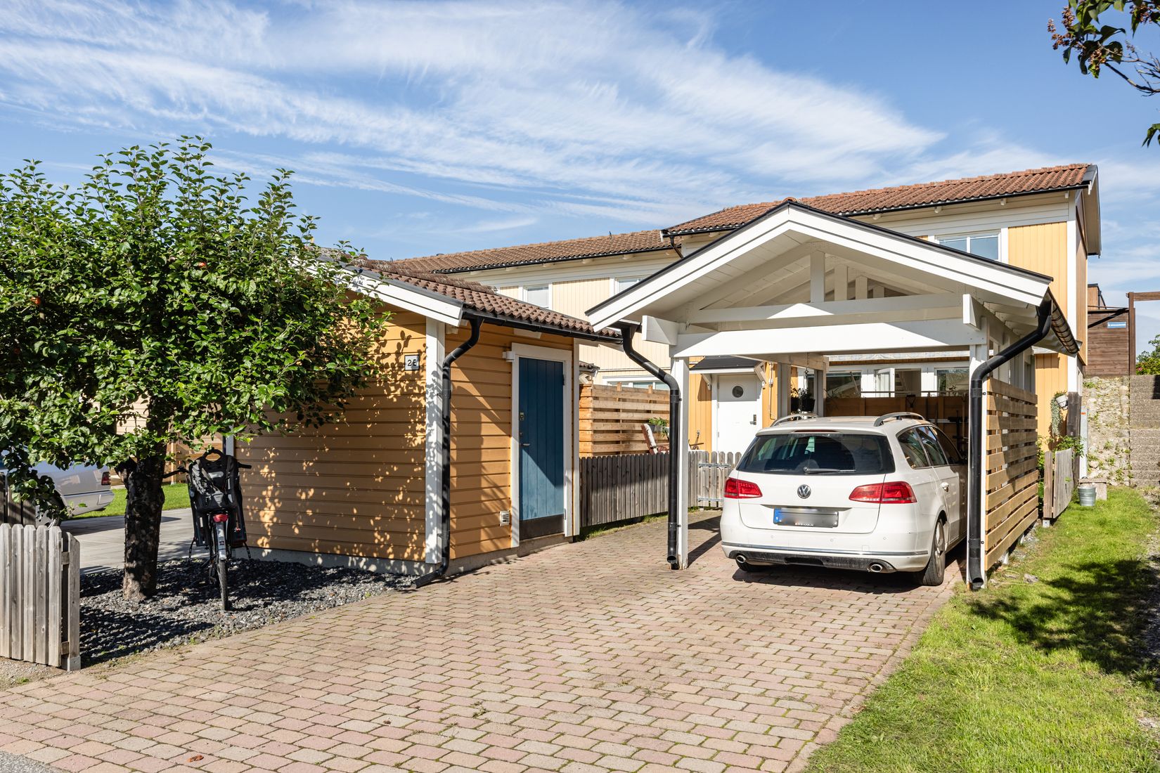 Till huset hör en stenlagd parkeringsplats och carport med utrymme för 1-2 bilar samt ett praktiskt förråd precis vid entrén – allt för att förenkla vardagen.