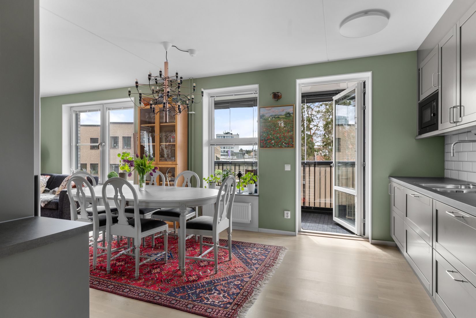 Kök och vardagsrum ligger i en öppen och social planlösning med plats för både matgrupp och soffhörna, vilket skapar en naturlig samlingspunkt i hemmet. Från köket nås den inglasade balkongen om 6 kvm i högt och soligt sydvästläge, där du kan njuta av många soltimmar och en förlängd utesäsong.