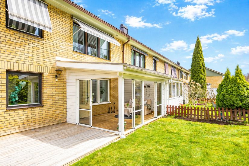Det som verkligen särskiljer denna bostad är läget i markplan och hörnläge. Här får du känslan av radhus med egna uteplatser i två väderstreck. På framsidan finns en trivsam yta med plats för utemöbler, grill och odlingar – en perfekt plats att njuta av vardagen. På baksidan öppnar sig en mer privat miljö med ett stort uterum, trädäck och gräsyta. Här kan du skapa en naturlig förlängning av bostaden och njuta av både umgänge och avkoppling stora delar av året.