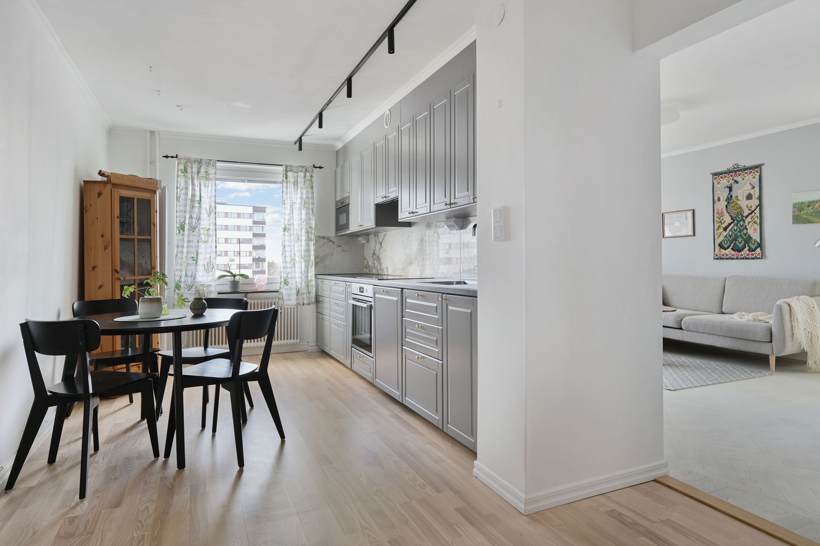 Vardagsrummet erbjuder generösa ytor för både soffgrupp och övrig möblering. Härifrån nås bostadens balkong i österläge, där du kan njuta av morgon- och förmiddagssol samt en fri utsikt över närområdet. Sovrummet är rymligt med plats för dubbelsäng och erbjuder bra förvaring genom flera inbyggda garderober.