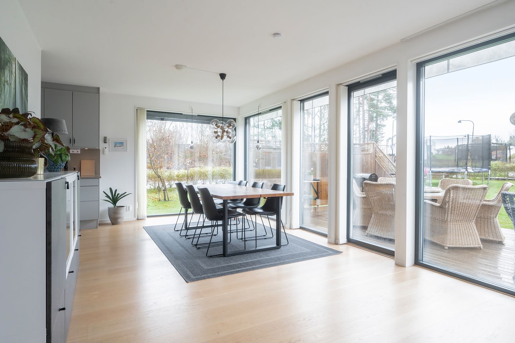 Som en extra guldkant erbjuder parhuset en fantastisk takterrass med bubbelbad och milsvid utsikt över Högmora, en perfekt plats för avkoppling eller sociala stunder med något gott i glaset.