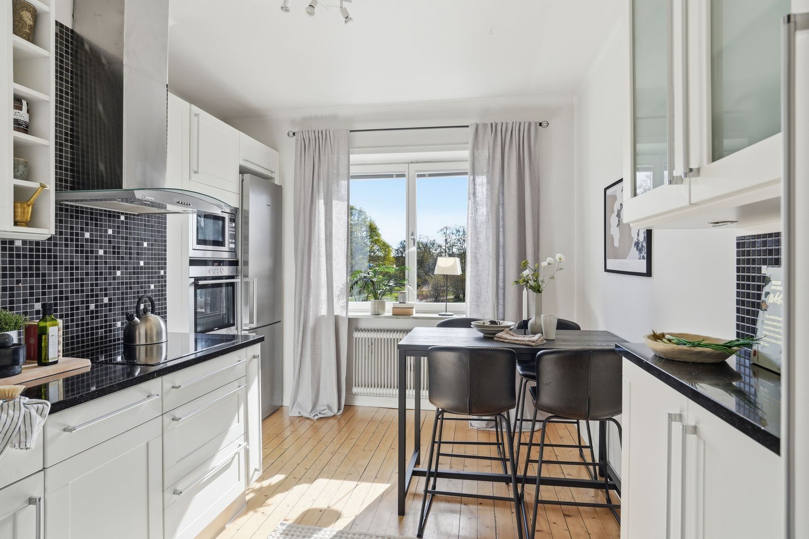 30-talsdetaljerna finns genomgående i bostaden med fina trägolv, fina fönsternischer och målade väggar med vita golvsocklar. Den extra takhöjden på 2,70 m gör att bostaden upplevs extra rymlig och tillsammans med de stora fönsterpartierna åt båda håll blir det ljust och trivsamt. Kök med plats för matbord, vit skåpinredning, svart mosaik och kompositbänkskiva. Stort sovrum med gott om plats för dubbelsäng och bra klädförvaring i garderobsvägg med skjutdörrar. Vardagsrum med plats för både matplats och soffgrupp. Här har du även utsikt och utgång till balkongen med eftermiddags och kvällssol. Kaklat duschrum. Utöver detta finns två rymliga förråd, det ena finns på vindsplan och det andra i källarplan.