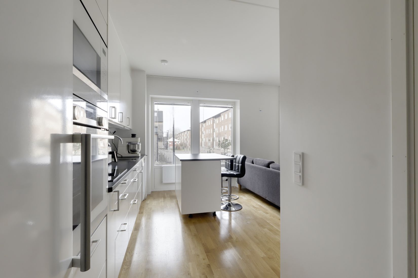 Köket är smakfullt utformat med vita skåpluckor och laminatbänkskiva som erbjuder gott om arbetsyta samt goda förvaringsmöjligheter. Diskmaskin ingår. Här finns plats för både matbord och soffgrupp. Mellan vardagsrum och sovrum finns dessutom en praktisk alkov som passar utmärkt som hemmakontor eller läshörna.