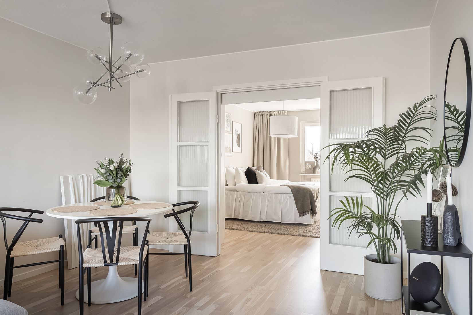 Bostaden erbjuder ett nyrenoverat och läckert helkaklat badrum i en beige färgskala, utrustat med dusch och tvättmaskin. Det ljusa allrummet rymmer både soffgrupp och matplats och har utgång till den mysiga balkongen, vilket skapar en härlig rymd och fint ljusinsläpp. Här finns charmiga pardörrar som leder vidare till ett av bostadens sovrum. Lägenheten erbjuder totalt två ljusa sovrum varav båda två med garderober. Köket är smakfullt utformat och har plats för en mindre matgrupp.