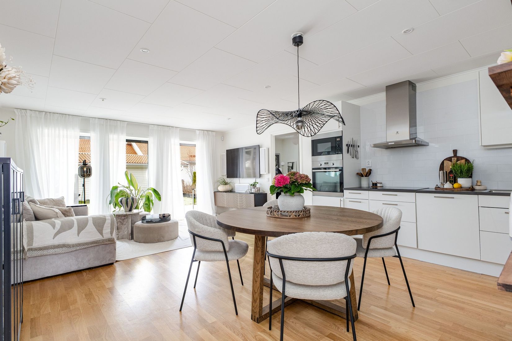 Det smakfulla köket från Marbodal går i en tidlös stil med vita luckor, mörkgrå bänkskiva och vitt kakel som stänkskydd. Här finns gott om arbetsyta och plats för matgrupp. Maskinell utrustning består av: kyl och frys, induktionshäll, spisfläkt, integrerad diskmaskin samt inbyggnadsugn och micro. Köket ligger i öppen planlösning mot vardagsrummet, vilket skapar en social och luftig känsla. Vardagsrummet rymmer enkelt soffgrupp och mediamöbel, och härifrån nås bostadens uteplats.