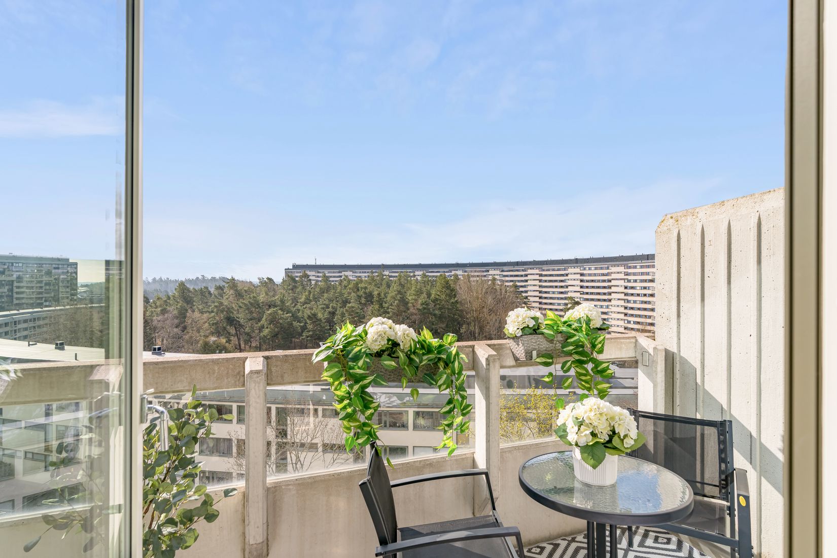 Här möts du av ett hem med generösa ytor och smarta förvaringslösningar i form av hela tre klädkammare. Bostaden har dessutom två balkonger i olika väderstreck, vilket ger fantastiska möjligheter att njuta av både morgon- och kvällssol. Den rymliga dubbelbalkongen i söder nås från både ett sovrum och det tidigare matrummet (idag sovrum), och bjuder på sol större delen av dagen. Den andra balkongen är inglasad och vetter mot norr – en perfekt plats för avkoppling året om, med utgång från ytterligare ett sovrum. Från sjunde våningen får du en härlig utsikt över den grönskande innergården samt Täby Centrum.