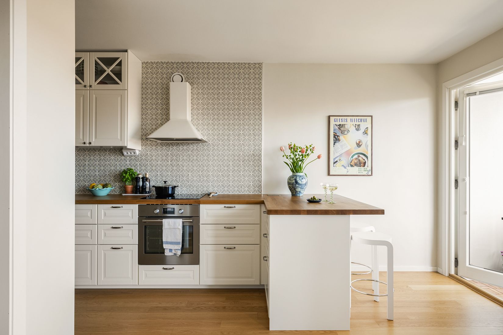 Den väl tilltagna balkongen rymmer både sittgrupper, planteringar och grill – en perfekt plats att njuta av såväl soliga dagar som stämningsfulla kvällar.