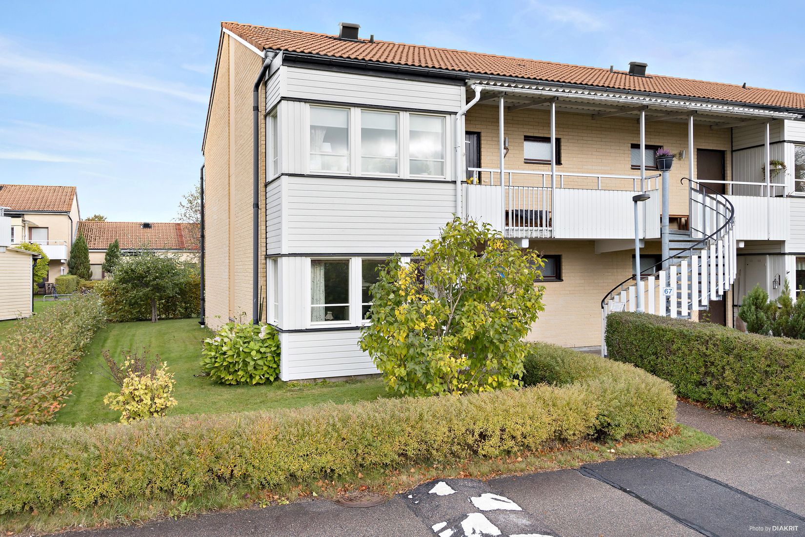 Nu finns tillfället att förvärva en stor tvåa om hela 77,5 kvadratmeter, i markplan med gavelläge! Och om inte detta vore nog finns det här även möjlighet till uteplats på både fram- och baksida. På den insynsskyddade baksidan finns idag ett inglasat uterum, och som så många av grannarna redan gjort, går det alltså att göra en uteplats även på framsidan. Gavelläget gör den här lägenheten perfekt för soldyrkaren, eller för den med husdjur då det även går att nyttja marken på gaveln. Pallkragarna som finns här lämnas kvar till köparen. Något för den med gröna fingrar?