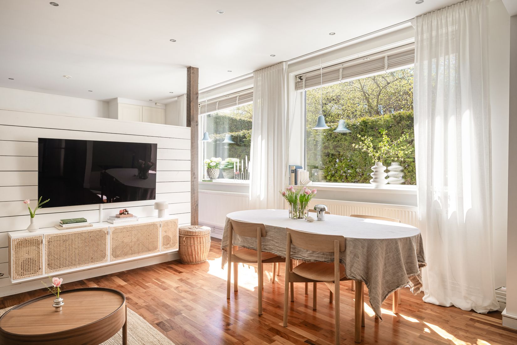 Bostaden präglas av generös takhöjd som skapar en härlig rymd och tillsammans med de stora fönsterpartierna fylls bostaden av ett naturligt ljusinsläpp som förstärker den öppna och luftiga atmosfären. Samtidigt är lägenheten helt insynsskyddad, vilket ger en avskild och lugn boendemiljö. Genomgående ligger ett vackert parkettgolv i valnöt som binder samman rummen på ett harmoniskt sätt och bidrar till en varm och ombonad känsla.
