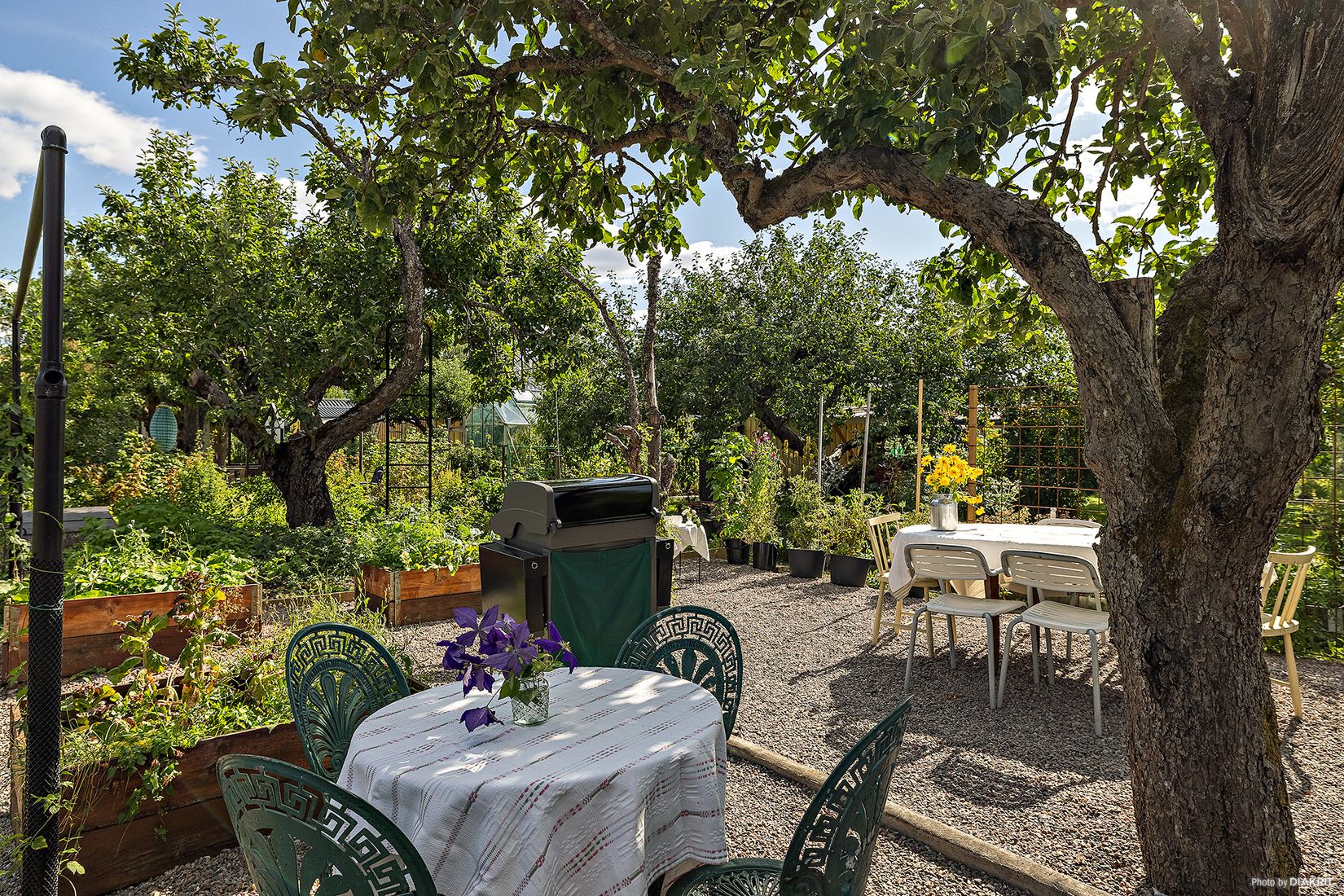 Trädgården är minutiöst planerad och genomtänkt in i minsta detalj. Flera vackert anordnade platser för både odling och sociala stunder skapar en harmonisk helhet. Under äppelträden finns lummiga favoritplatser som erbjuder svalka under varma sommardagar.